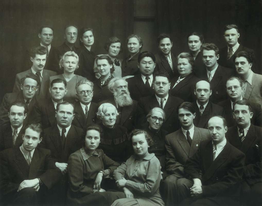 Профессор Мещерский Иван Всеволодович (Теоретическая механика) и профессор Гернет Надежда Николаевна (математика) среди курсисток физико-математического факультета Бестужеских курсов. 1914 г. Булла.